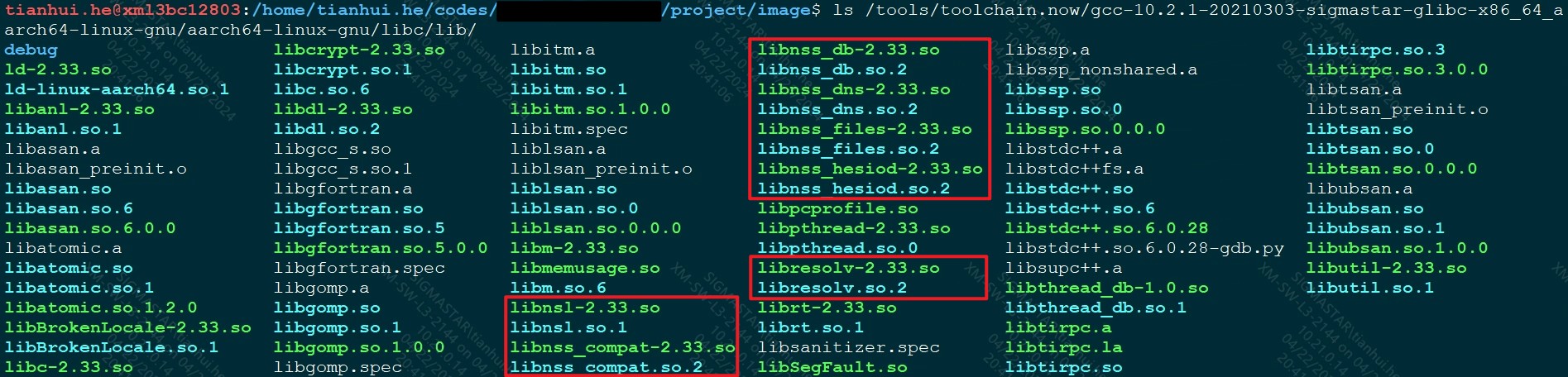 DNS depends on libresolv, libnsl, and libnxx_* series library files, which are not packaged into the upgrade image by default. They can be obtained from our supporting cross-compilation toolchain when needed. For example, in the cross-compilation toolchain of gcc-10.2.1, the library files that dns depends on are located in gcc-10.2.1-20210303-sigmastar-glibc-x86_64_aarch64-linux-gnu/aarch64-linux-gnu/libc/lib/, as follows: