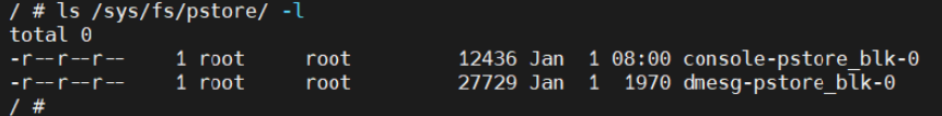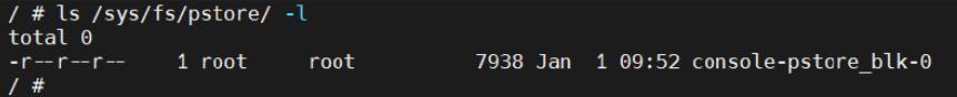 After the burning is complete, boot to the Linux command line and then reboot Linux. You can see that after Linux restarts, the pstore module generates the console-pstore_blk-0 file, and its content is the Linux dmesg log. This file will be regenerated every time Linux reboots.
