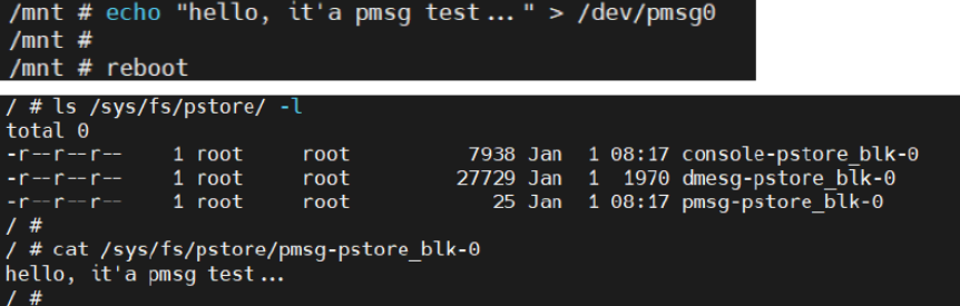 /dev/pmsg0. After Linux restarts, the pstore module will generate the pmsg-pstore_blk-0 file, which stores the content written by the user before Linux restarts.