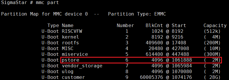 Step 1. Determine the location of the pstore partition in eMMC. You can check this by executing the "mmc part" command in U-Boot: