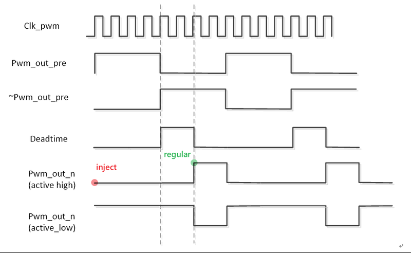 pwm_out_n: Based on the negative PWM wave generated after the dead time setting, the sampling time of the regular sequence is the rising edge of the pwm_out_n waveform, and the sampling time of the inject sequence is the starting point of the pwm cycle, as shown in the figure: