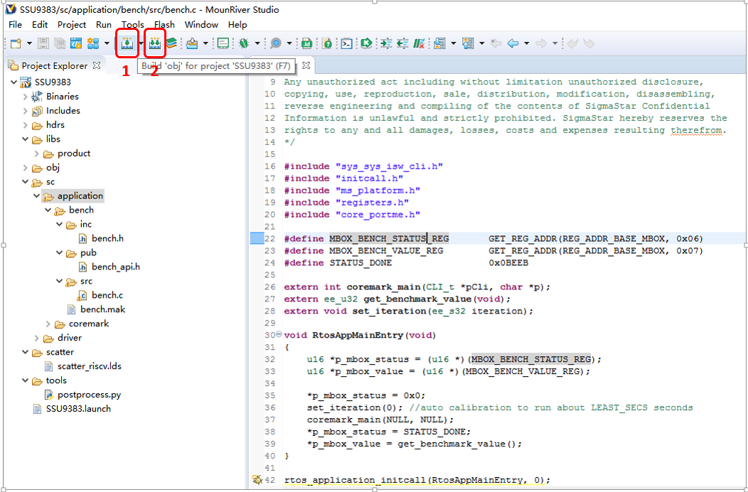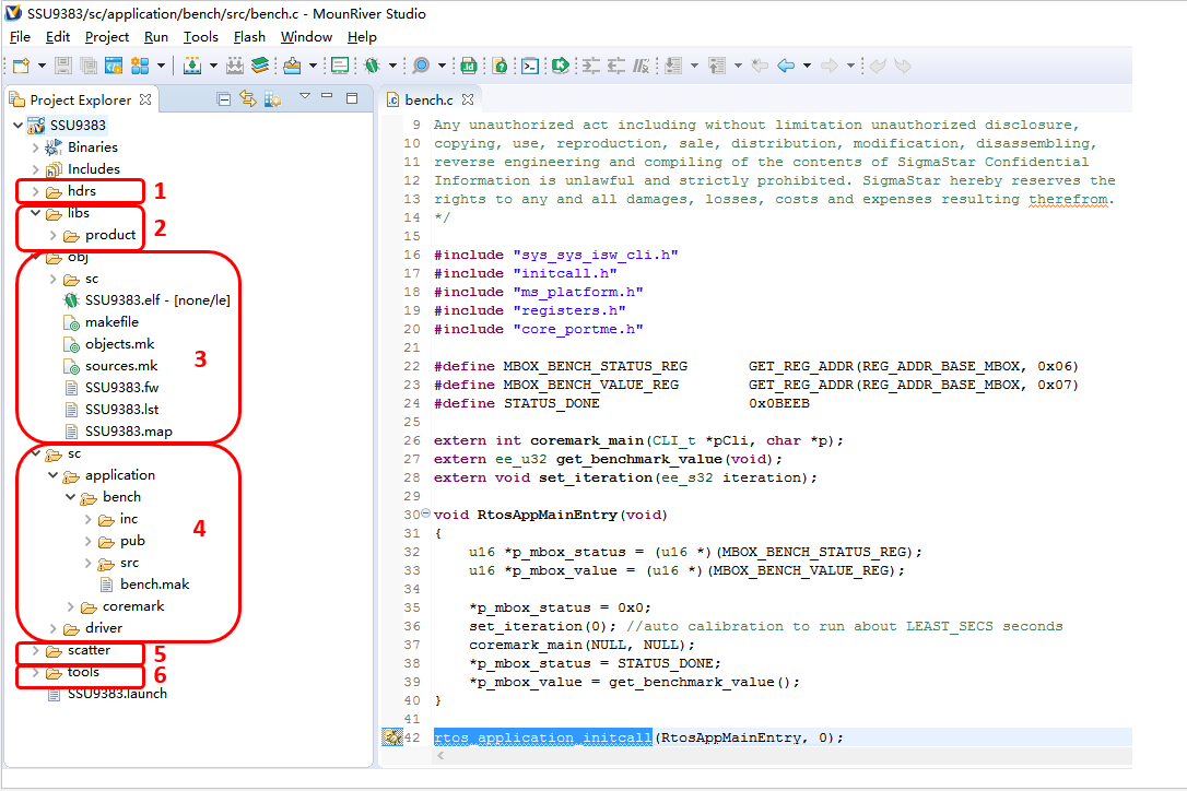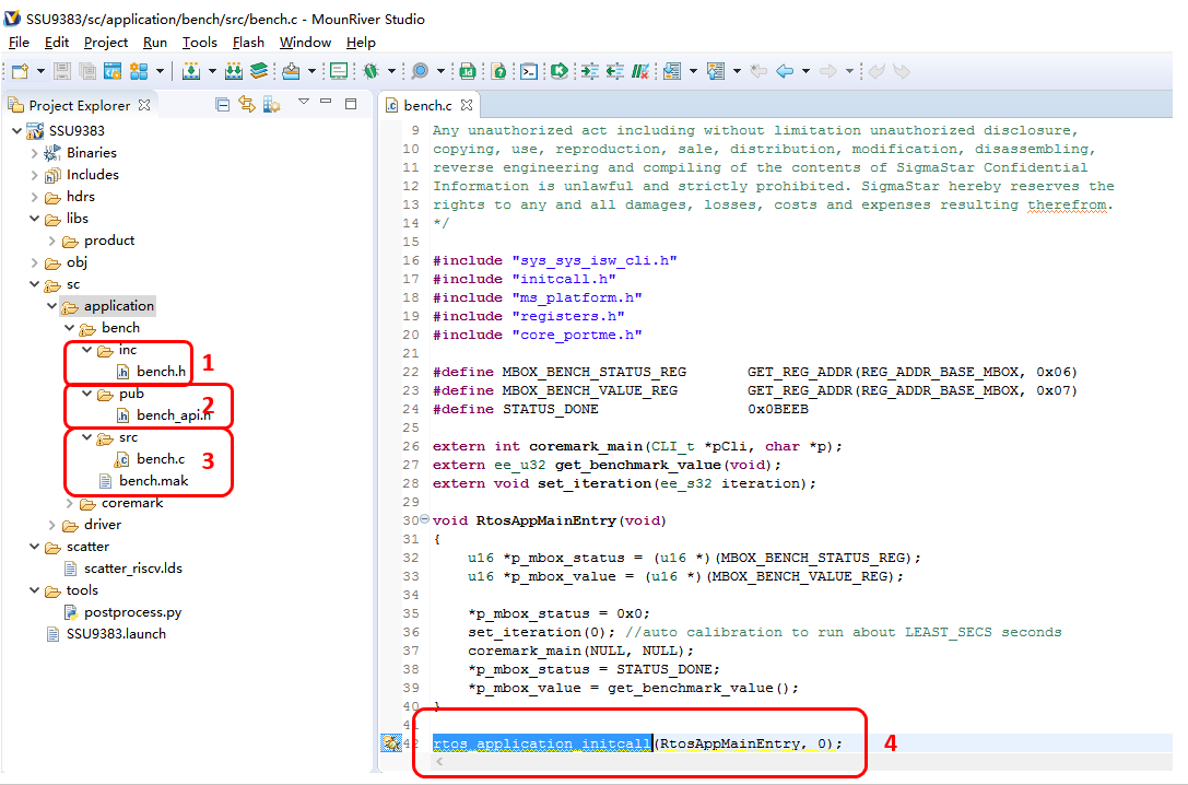 The entry function RtosAppMainEntry() of the Bench module simply calls the coremark_main() function to perform the coremark operation.