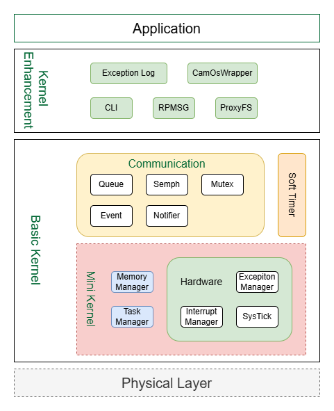 Basic kernel layer: The basic kernel layer mainly includes hardware-related driver code, CPU-related interrupt management, exception management, system clock, and basic task management and memory management provided by the operating system. In addition, the kernel also provides a series of communication tools such as message queues, semaphores, etc. The task management and communication-related components are the same as the official usage of FreeRTOS. Please refer to the official documentation provided by FreeRTOS;