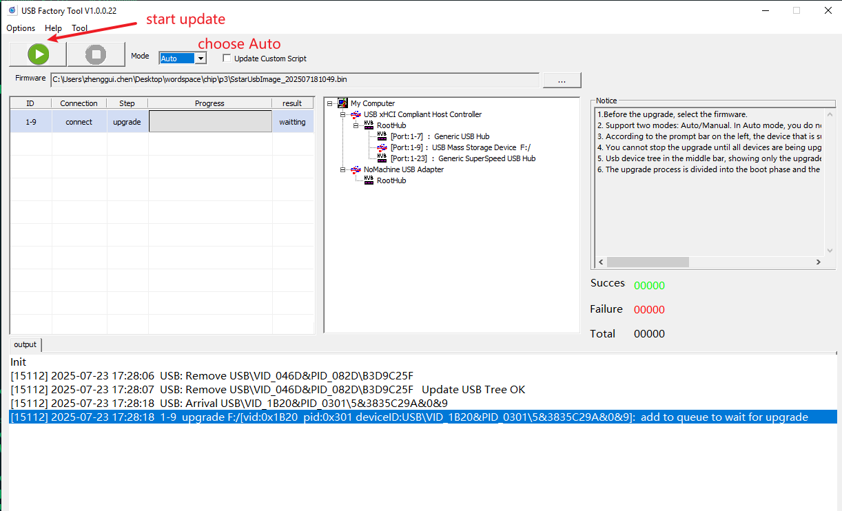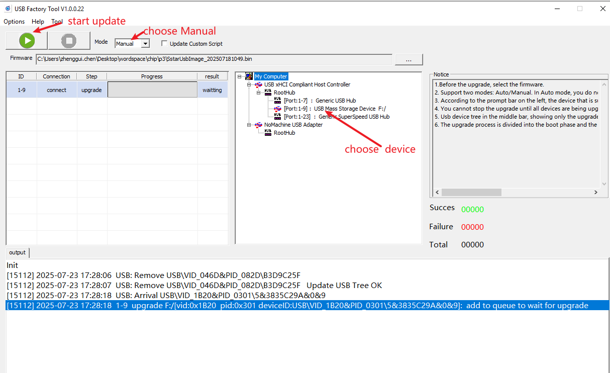 Manual mode is generally used for development. You need to select a device to upgrade, as shown in the figure below. You need to manually select the upgrade device (USB mass storage device), and then click the upgrade button, as shown in the figure below.