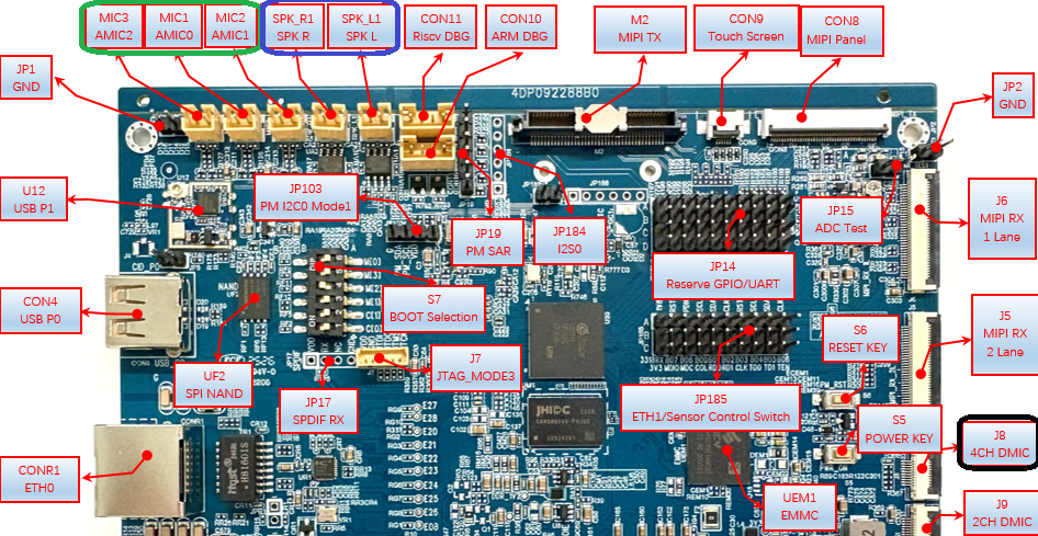 3.1. AMIC connects to MIC0,MIC1,MIC2 (as shown in the green box in the image), and the speakers connect to SPK_L and SPK_R (as shown in the blue box in the image);