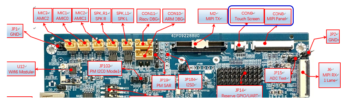 Connecting MIPI screen and touchscreen: Insert the touchscreen and MIPI screen FPC cables into the CON9 and CON8 interfaces on the board.