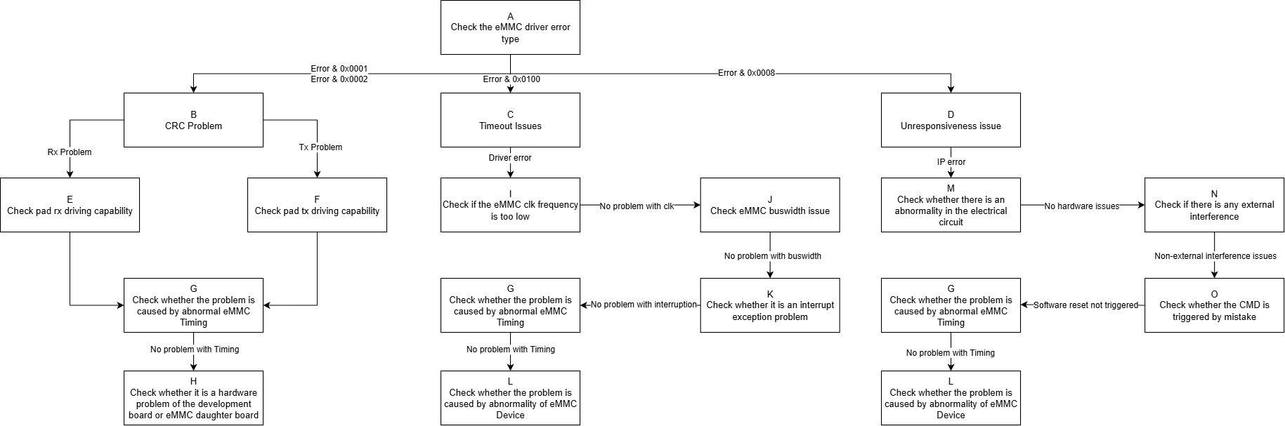 | C | 1. If the driver read/write operation reports a timeout issue, capture the waveform immediately to confirm whether there is a transmission performance issue 2. If there is no issue with the waveform, check whether the eMMC MIE interrupt is reported or received normally, see 3. Check if there are any abnormalities in eMMC Timing, common Timing issues can be found in 4. If none of the above issues exist, consider whether the eMMC Device is abnormal |