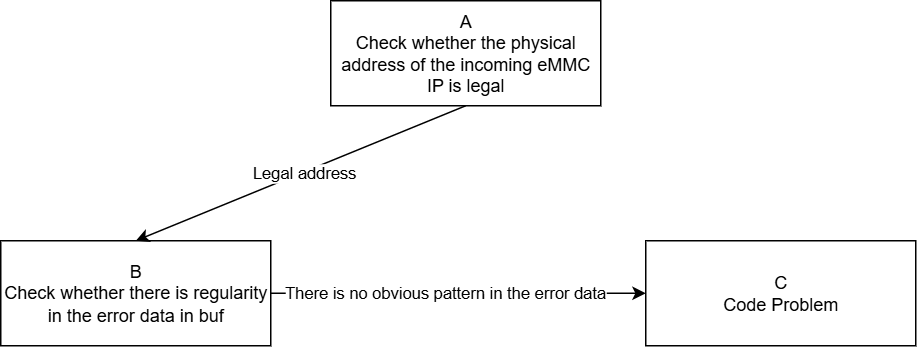 | B | 1. Construct a test pattern, confirm whether there is a regularity in the differences between the source pattern and the read/write obtained pattern, refer to "SD_EMMC Stress Test Reference", and use the fio tool to specify the pattern | Exit Condition 1: 1. The pattern error is obviously regular, always occurring with the eMMC driver Cache-line size error Exit Condition 2: 1. The pattern error has no obvious regularity |