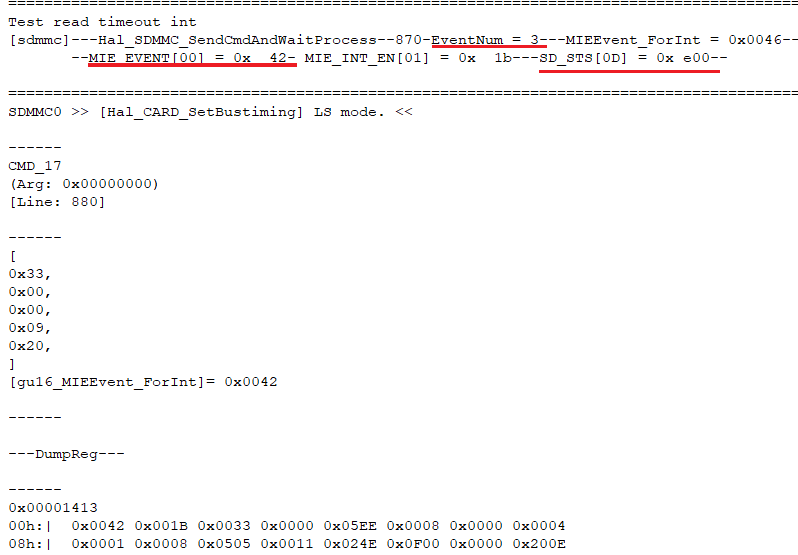 Here, you can focus on the key information printed by the driver, 'eventnum=3' indicates that it is waiting for a read cmd with data, 'MIE_EVENT[00]=0x42' indicates that only the cmd response was received, but the dat_end event was not received.