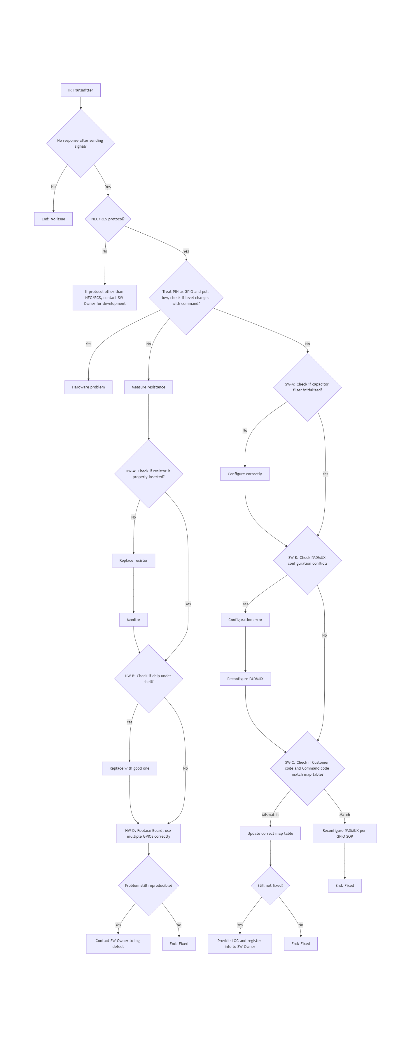 When checking for no response after the IR transmitter sends a signal, you can manipulate the registers to set the corresponding PIN as GPIO and pull it high or low (note that some PINs may not have GPIO functionality as the highest priority, in which case you need to clear higher priority settings first). If the actual output level does not change, it can be determined to be a hardware issue, and the following sequence can be used for troubleshooting: