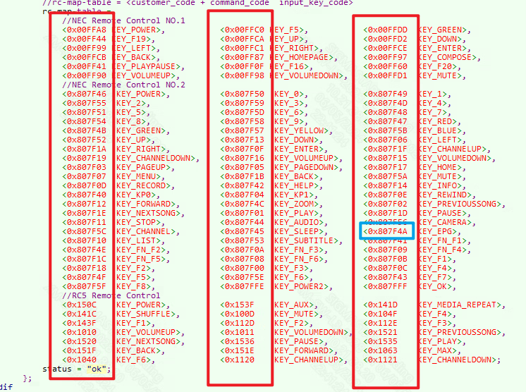 The red box shows the customer code and command code of the IR signal that needs to be configured. If the sampled IR signal is not configured in the rc-map-table, the input subsystem will not report the corresponding key value for that signal. Since 0x807F4A is already configured, and the corresponding key value is KEY_EPPG, every time the IR signal is received, it will report and process the key value KEY_EPPG.