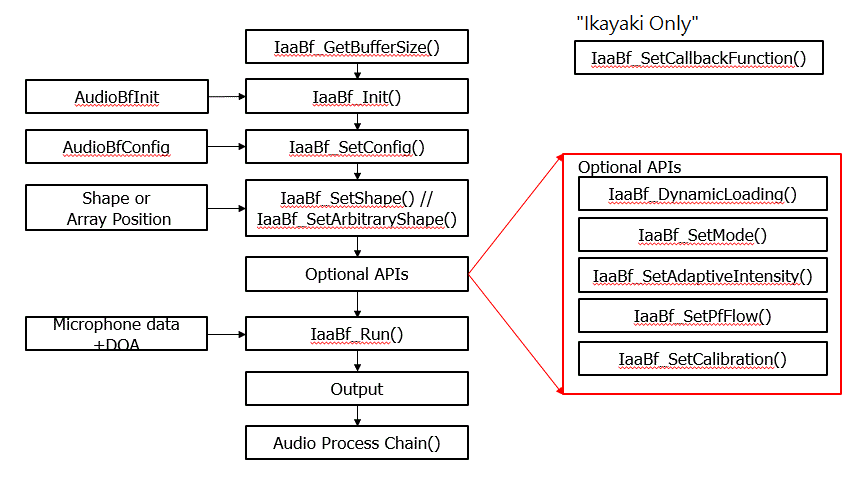 For dual microphone array (the microphone input is binaural data), the data pointed to microphone_input should use the sampling point as the smallest unit and be placed in the format of L,R,L,R … .The length must correspond to the point_number (the number of sampling points once beamforming process) set in IaaBf_Init.