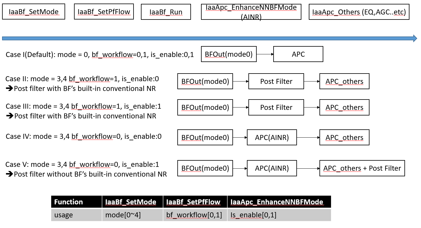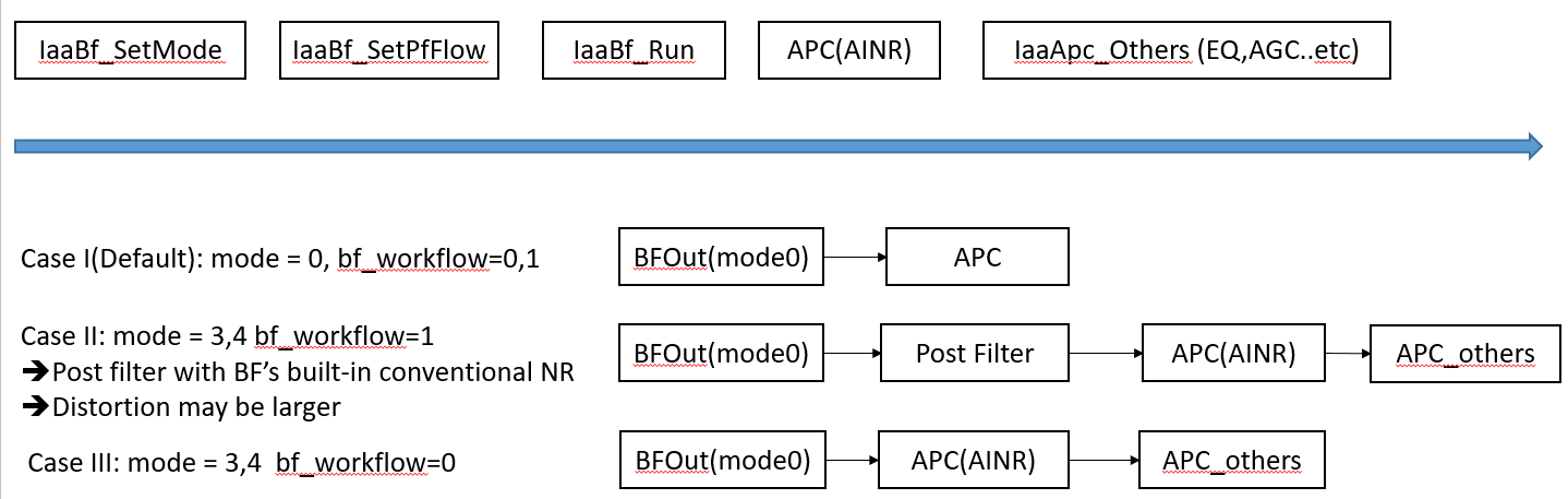 When either BF mode 3 or BF mode 4 and APC are used simultaneously and the deep learning based noise reduction is enable(AudioAnrConfig anr_filter_mode 5), IaaApc_EnhanceNNBFMode must be called in APC algorithm.