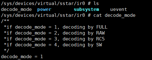Currently, it supports switching the IR decoding mode in user space. Check the files in the /sys/class/sstar directory. The configuration of several groups of IR devices corresponds to several IR nodes. echo [mode] > decode_mode can switch the IR decoding mode. The mode input value can be: 1→FULL, 2→RAW, 3→RC5, 4→SW.
