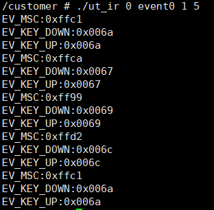 ut_ir.c mainly obtains the input event type and key value by reading the event interface, and transmits the information to the user state through struct input_event. Every time the remote control sends an IR signal, the event type of input_event will change in the following order: EV_MSC->EV_KEY->EV_SYN->EV_KEY->EV_SYN.