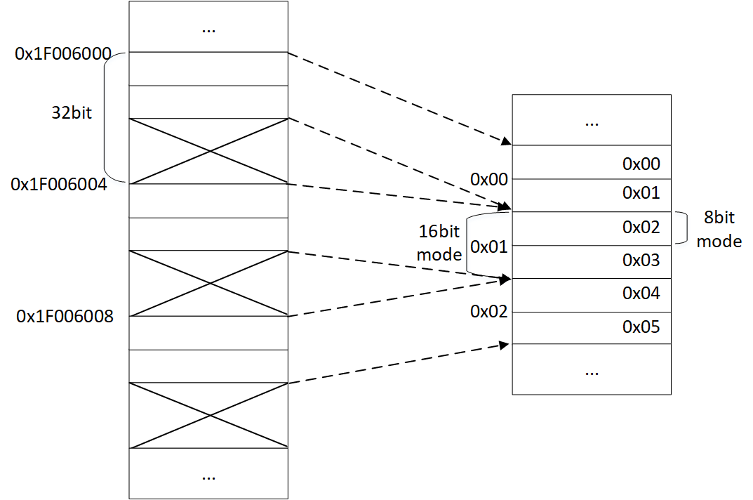 The figure below intuitively shows the difference between the ARM CPU bus register address and the register 8-bit mode and 16-bit mode.