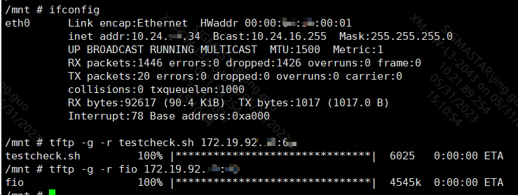 After mounting the test partition, configure the network parameter information, enter the /mnt path, Put fio and the testcheck.sh script file in the attachment emmc_voltage_drop_test.zip into the path. Remember to dos2unix testcheck.sh and give execution permissions +x to fio and testcheck.sh at the same time.