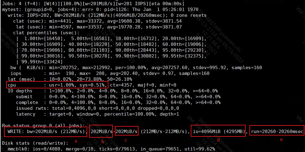 io: The cumulative I/O size executed by all threads in this group (d), here the four threads cumulatively write 4096M (The numbers in brackets are in the form of powers of 10).