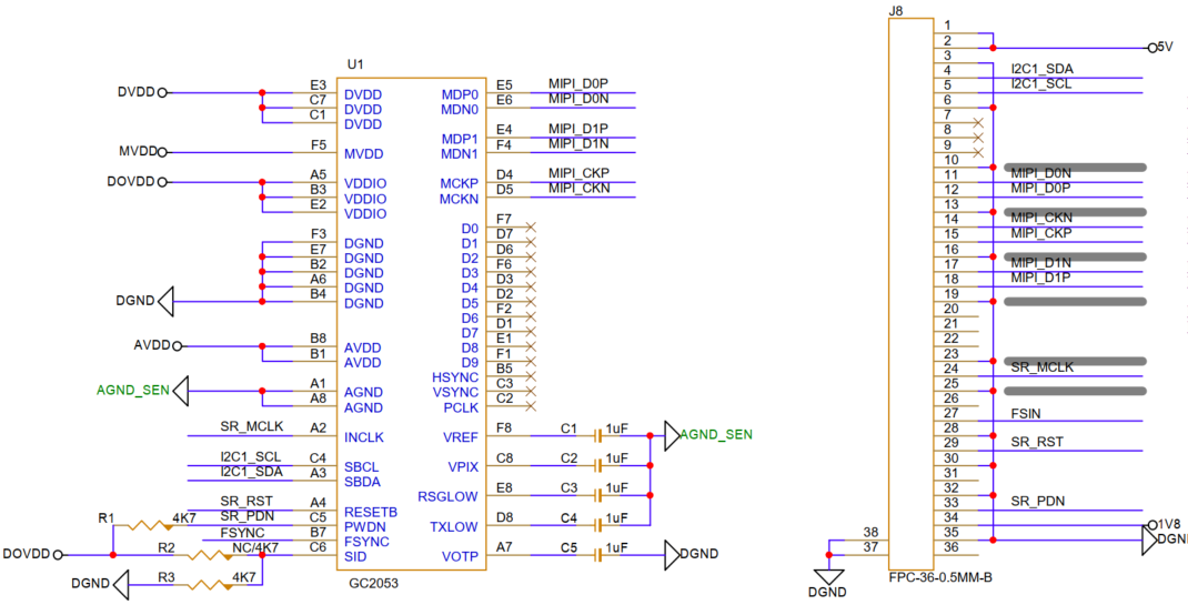The schematic diagram of the GC2053 MIPI interface board is as follows. J8 on the right side is a terminal block; video streaming can be achieved by connecting one end of a flat cable to J8 and the other end to J5 or J6 on the Comake_Pi_D1 board. It can be seen that the pinout of the J8 terminal block matches that of J5 and J6.