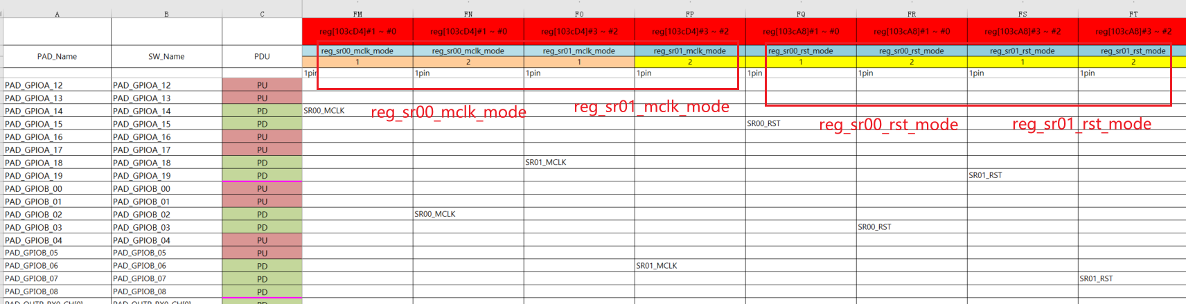 Writing different values to the reg_sr00_mclk_mode and reg_sr01_mclk_mode registers will result in different configurations of the SoC's external sensor MCLK pins. Similarly, writing different values to the reg_sr00_rst_mode and reg_sr01_rst_mode registers will lead to different configurations of the SoC's external sensor RST pins. In the DTS, the snr_sr0_mipi_mclk_mode configuration item is used to pass values to the reg_sr00_mclk_mode register, and the snr_sr0_mipi_rst_mode configuration item is used to pass values to the reg_sr00_rst_mode register.