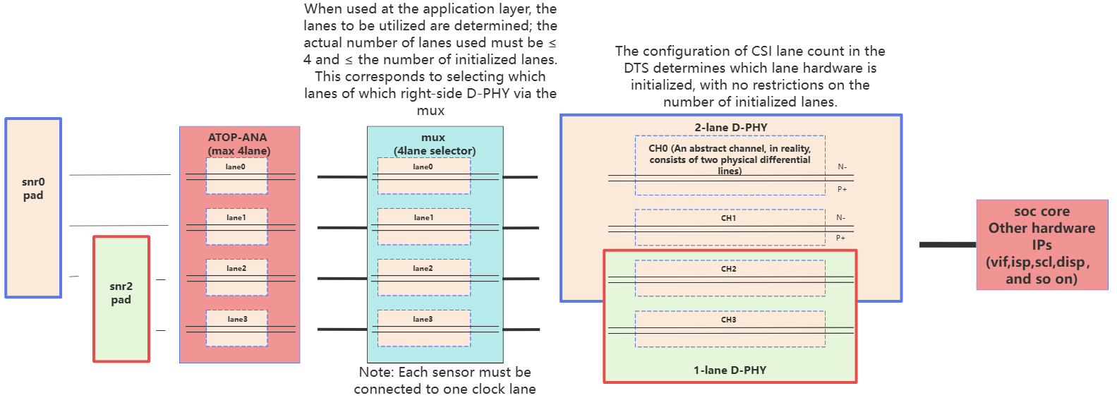 The CSI-2 interface RX receiver of the MIPI protocol suite inside the SoC chip hardware supports 2 data lanes and 2 clock lanes, and its configuration methods are as follows: