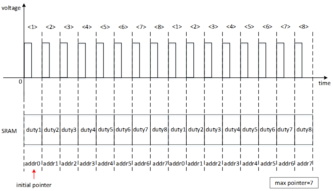 Each group of spwm shares a duty table, which can be abstractly understood as an array. It can store up to 64 duty values. When spwm is started, it will output the corresponding duty in each carrier cycle in the order of the duty table.