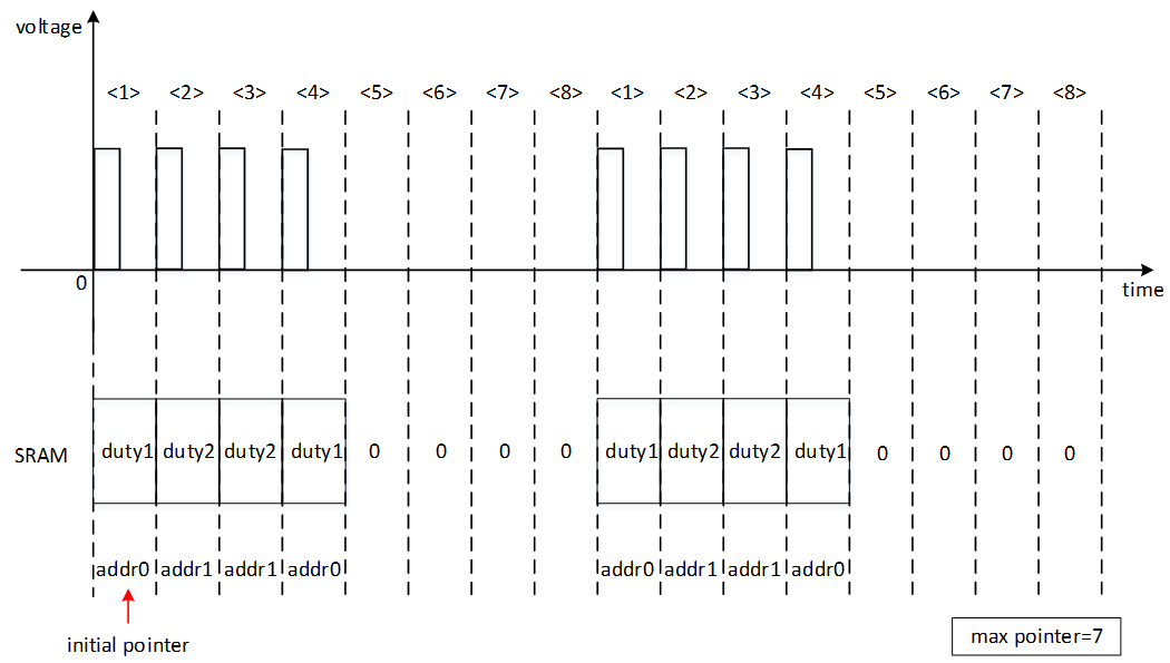 The same group of SPWMs share a duty table, supporting up to 16bit * 64 duty configurations, that is, one modulation cycle supports up to 64 different duty cycle settings