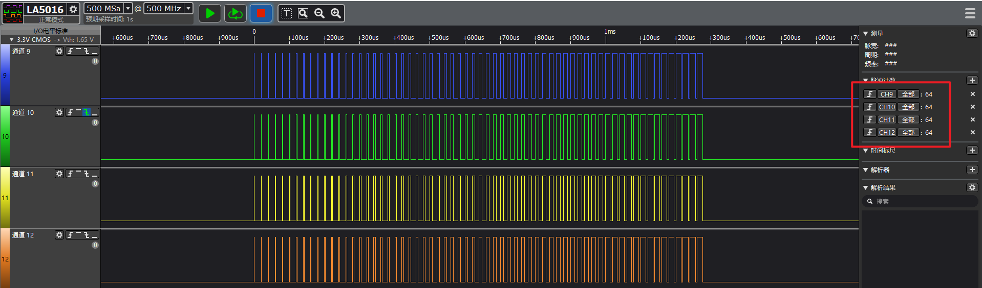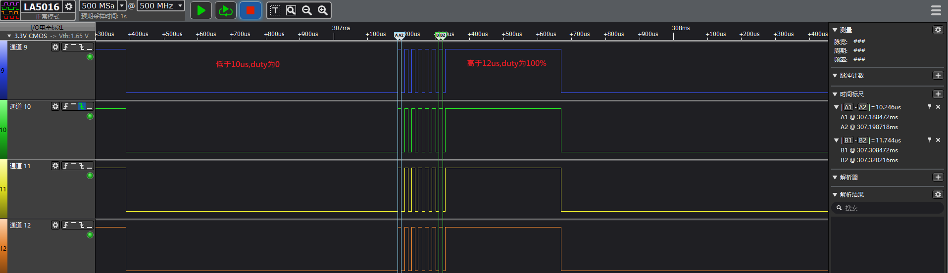 With OSCCLK at 12MHz, carrier period at 50KHz, duty cycle range set in the duty table at 250ns~16000ns, and duty cycle clamp upper and lower limits set at 10000~12000ns, the output waveform is as follows:
