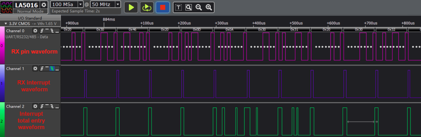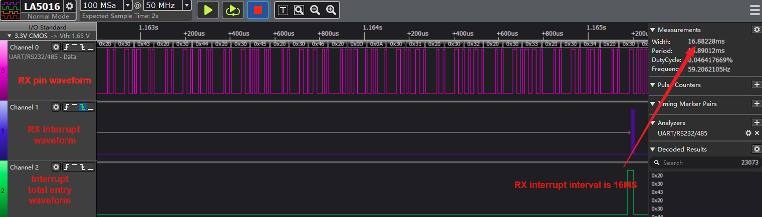 2 When UART interrupts, Linux interrupts are turned off (spin_lock_irqsave, etc.), so the UART interrupt will also be processed with a delay. Generally, the second case causes the loss of RX received data. Only when the baud rate is very high will the first case cause UART RX data loss. It can be determined by pulling the selected GPIO at the entrance of UART interrupt and Linux interrupt processing, and using LA to capture UARTRX and selected GPIO waveforms. The waveform of normal situation is shown in Figure 7-2. It can be seen that when the RX pin receives a Byte of data, it will wake up the RX interrupt once to take the data in the FIFO. The error situation is shown in Figure 7-3. At this time, the RX interrupt is woken up once after an interval of 16MS. The length of our hardware RX FIFO is 32Byte. Under the typical 115200 baud rate, data is continuously received. As long as the 2.78ms interrupt is not processed, data will be lost because the FIFO is full. Therefore, as long as there is a shutdown interrupt for more than 2.78ms in the system, it will theoretically cause UART reception to lose data.