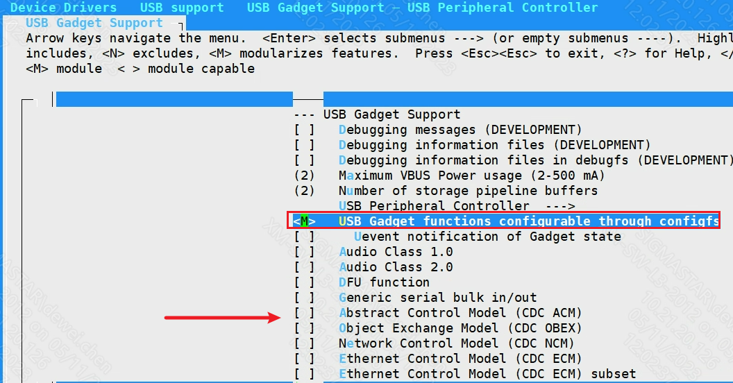 Use the configfs script to enable gadget configuration. The red arrow points to the specific device function to be configured. (generate libcomposite.ko, and the ko of the specific function (usb_f_xxx.ko))