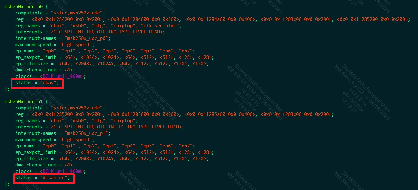 The corresponding nodes in pcupid.dtsi are as follows, msb250x-udc-p0 and msb25x-udc-p1 correspond to P0 and P1 respectively, and the default status is okay and disabled respectively.