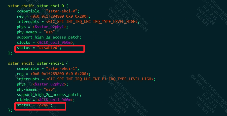 The corresponding nodes of pcupid.dtsi are as follows. When USB2.0 is configured as host, the status of sstar_ehci0/sstar_ehci1 nodes needs to be set to okay. Currently, ehci0/ehci1 is disabled/okay by default.