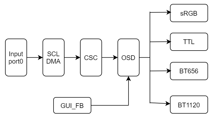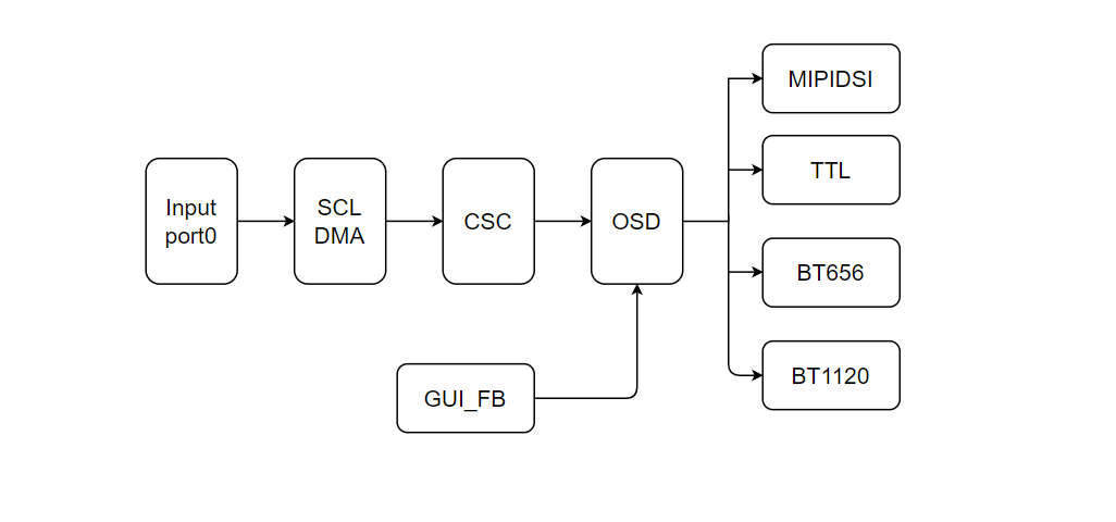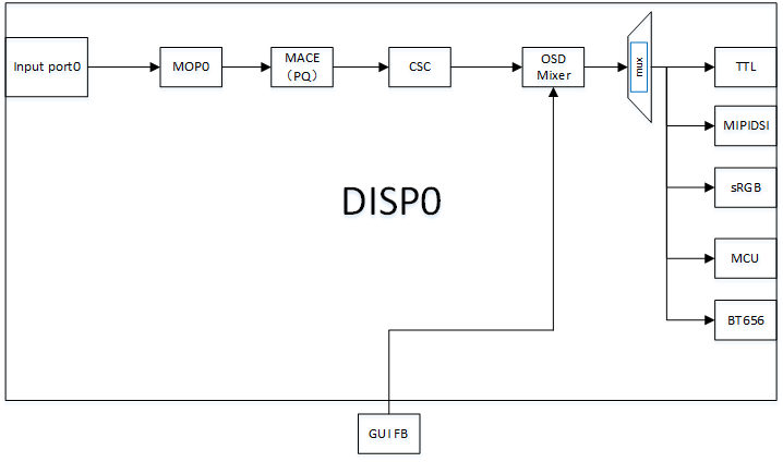 The DISP is a video processing and display unit. Its main function is to perform hardware image splicing and image effect processing on the images output from the front end, and then output the processed images to the display through interfaces such as HDMI, VGA, MIPI, and TTL.