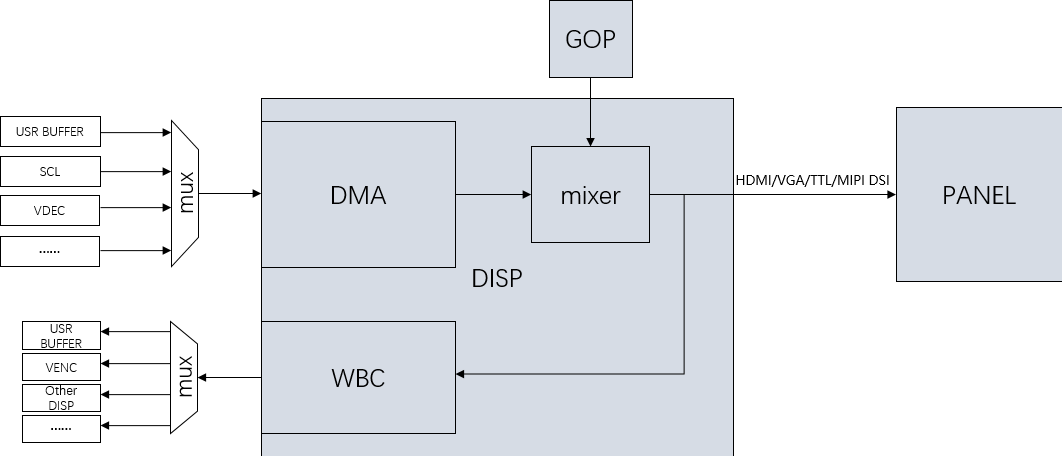 As shown in the above figure, from the perspective of usage scenarios, the DISP front-end can be bound to VDEC, SCL or other modules, or it can be a User Input Buffer; the output module of WBC can be VENC, Other DISP, or it can be a User Output Buffer.