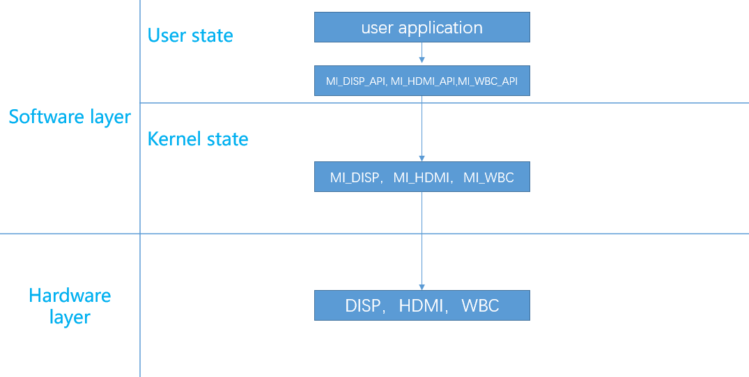 From the perspective of software development, the layered structure of the DISP software is as shown in the following figure. Users mainly operate the DISP/HDMI/WBC hardware through interfaces such as MI_DISP_API/MI_HDMI_API/MI_WBC_API.