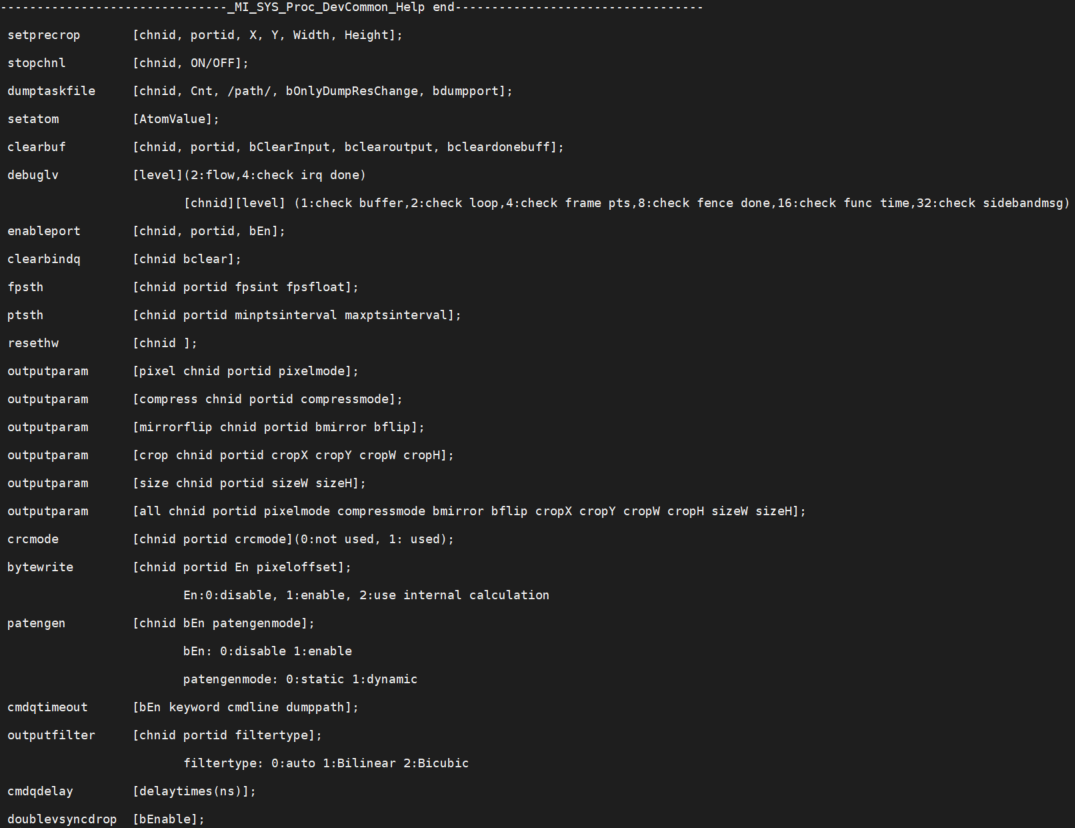 | Example | echo 1 cat /proc/mi_modules/mi_isp/mi_scl0 /mnt/cmdqerr.txt > /proc/mi_modules/mi_isp/mi_scl0 |