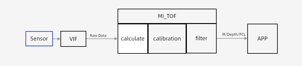 MI_TOF receives raw data from SENSOR->VIF, sends it to the internal algorithm processing demo calc_depth, and goes through calculate, calibration, and filter processes in sequence to output depth data.