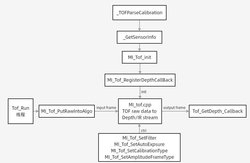 - MI_TOF_init:Tof initialization, create Algorithm thread, register algorithm callback Calc_depth.