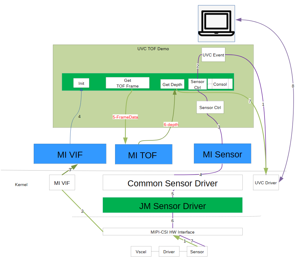 2.MI VIF:Receive the data from the sensor module and send it to the TOF algorithm processing function for calculating the DEPTH data.