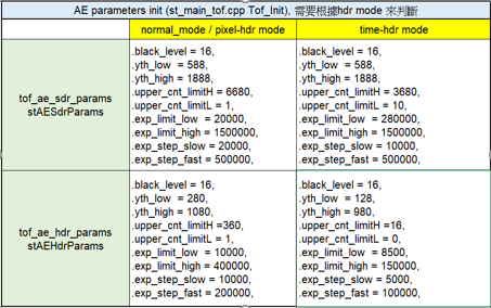typedef struct _tof_ae_hdr_params { uint16_t black_level; uint16_t yth_low; uint16_t yth_high; uint16_t upper_cnt_limitH; uint16_t upper_cnt_limitL; uint32_t exp_limit_low; uint32_t exp_limit_high; uint32_t exp_step_slow; uint32_t exp_step_fast; }tof_ae_hdr_params; -