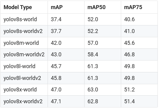 Yolov8-world incorporates this real-time open vocabulary object detection method, enabling the detection of any object in images based on descriptive text. Yolov8-world significantly reduces computational requirements while maintaining highly competitive performance. Yolov8-world provides several different model sizes: s, m, l, and the accuracies of these open-source models are as follows: