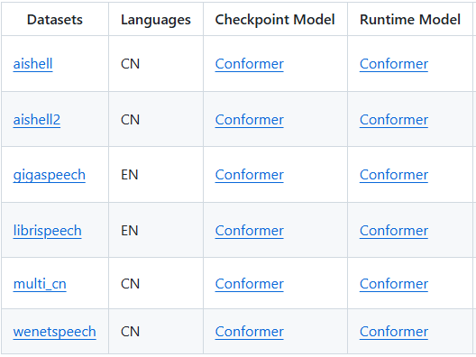 由于Conformer官方未提供模型权重, 本项目的模型来源于Wenet框架。Wenet所开源的Conformer模型列表如下: