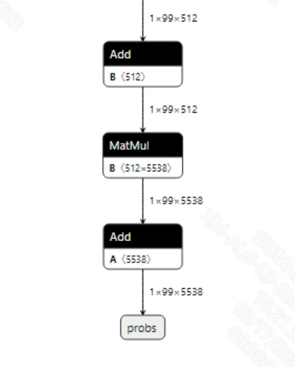 转换成功的conformer_sim.onnx模型输出信息如下图所示, 输出维度为(1, 99, 5538), 其中99是输出的文本长度, 5538是类别。获取到输出的特征后, 需要先经过log_softmax处理, 然后采用gready search的方式对输出特征进行解码, 才能转换出文本序列。