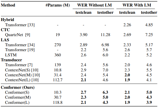 Conformer模型是一种结合了Transformer的自注意力机制和CNN卷积模块的混合模型, 主要用于语音识别领域, 能够将输入的音频转换为对应的文本序列, 具体精度情况如下: