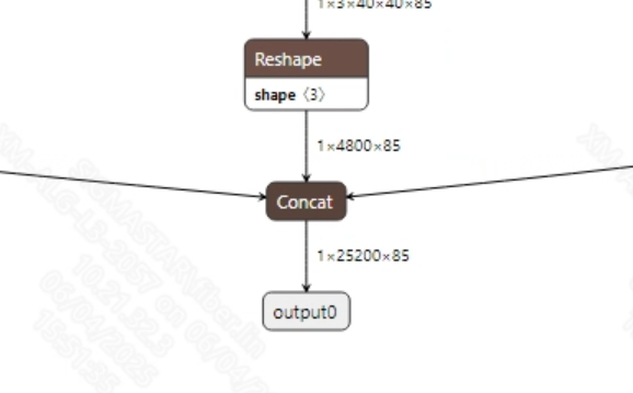 转换成功的yolov5s.onnx模型输出信息如下图所示, 通常yolov5s转换出来的模型输出维度为(1, 25200, 85)。其中, 25200 是候选框的数量, 85包括1个置信度、4个边界框坐标和80个类别概率。获取到模型输出的候选框后, 需要对所有候选框的类别进行判断以及NMS非极大值抑制操作后才能输出正确的坐标框。