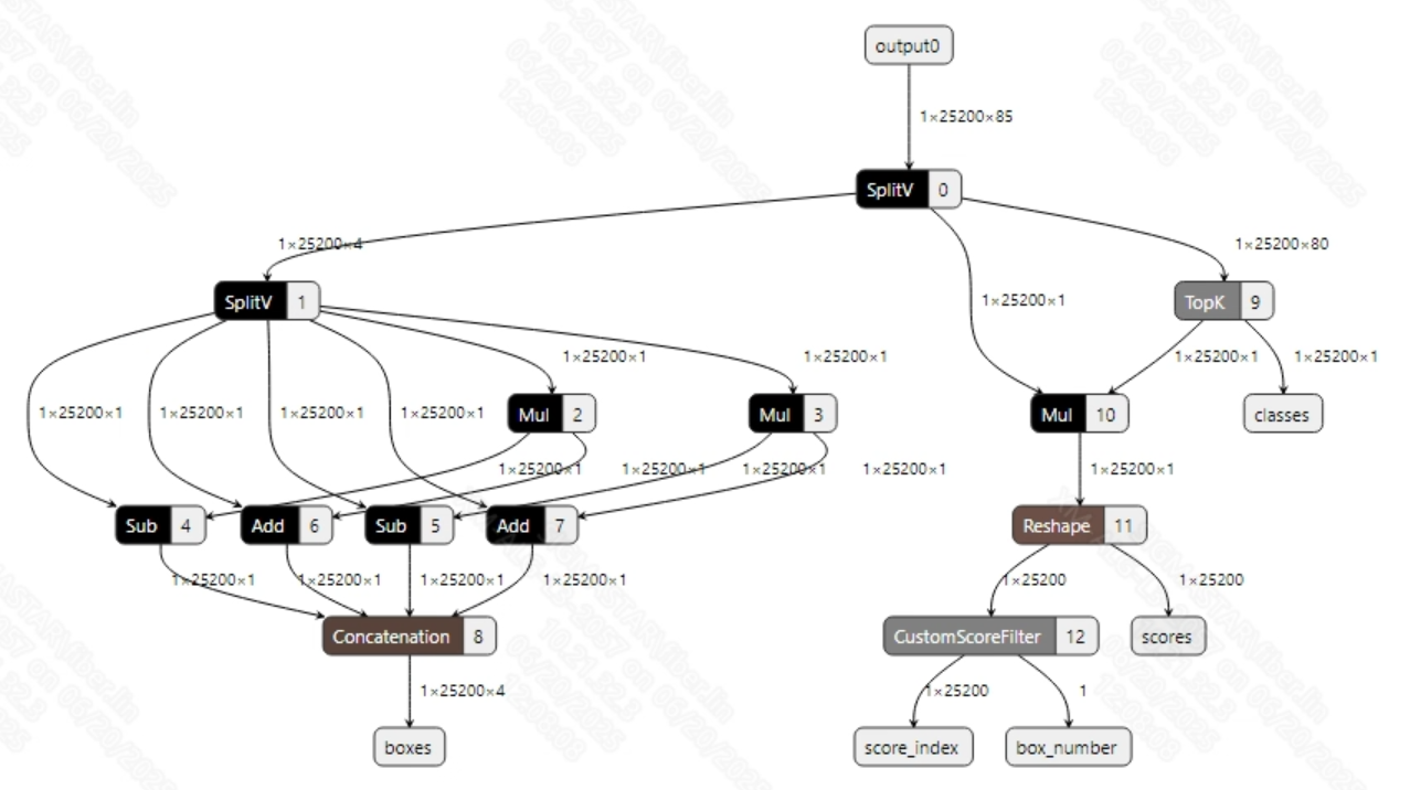 通过SGS_IPU_Toolchain构建后处理模型(如下图所示), 然后跟官方的yolov5模型进行拼接。这样就可以将遍历所有候选框的计算放到ipu上进行, 同时不改变yolov5官方模型的结构。因此用户在转换模型以及运行板端示例时:
