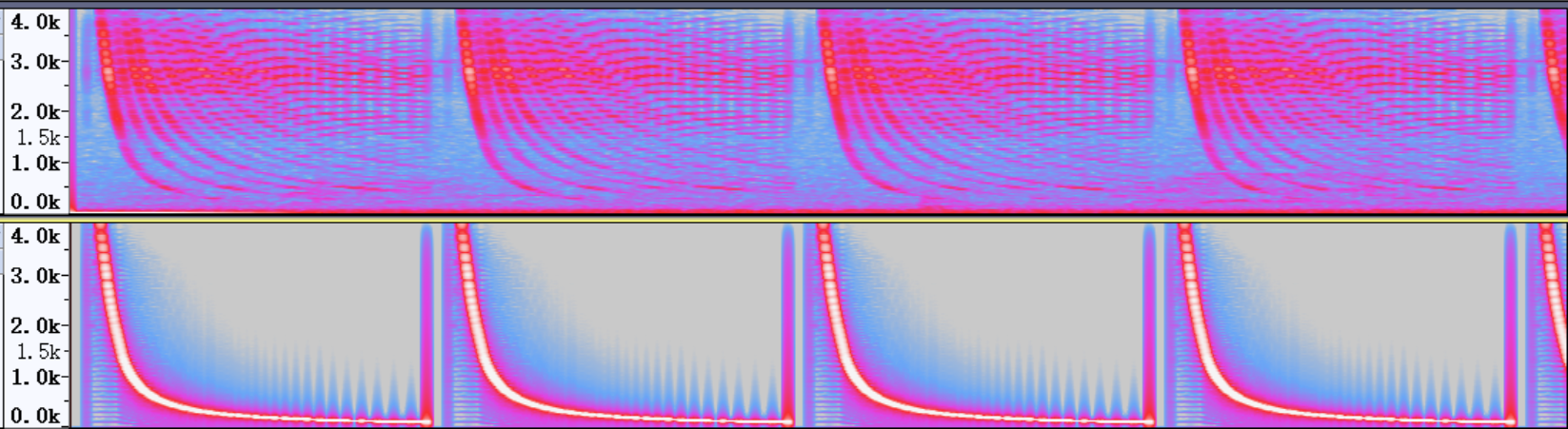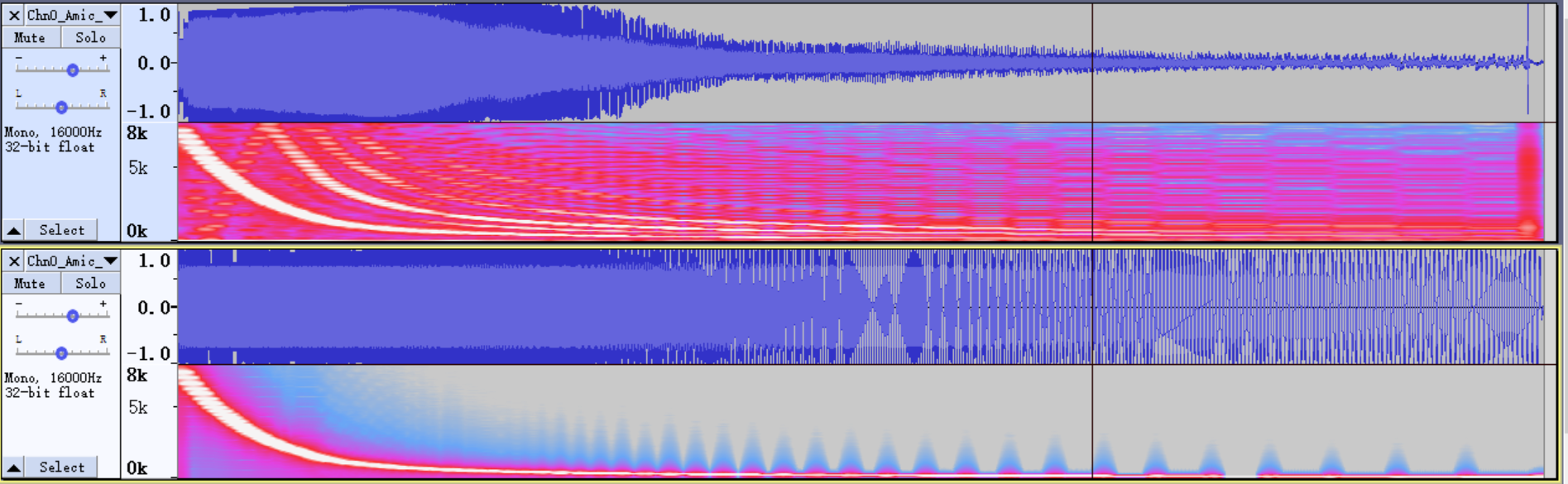 As shown below, the audio files are AecAiIn, AecAoIn and AecOut. Speaker distortion makes AecAiIn to have a frequency band, which AecAoIn does not have (the marked part in the figure), which causes the AEC algorithm to fail to obtain the correct reference signal and makes the AEC algorithm incompletely eliminated. The frequency band where the echo exists is exactly the frequency band produced by the speaker distortion.