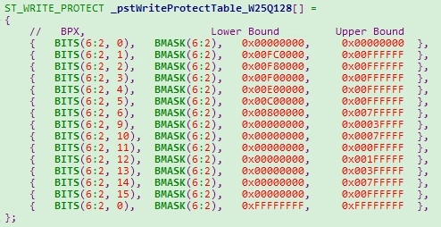 _pstWriteProtectTable_W25Q128 stores the information of W25Q128 Flash Write Protect:
