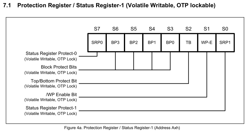 Take W25Q128 as an example, its Write Protect function is realized by writing bit 6: bit2 of Status Register 1: