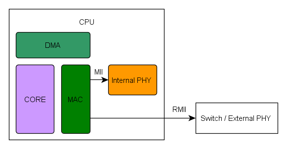 RMII接口包括一个数据接口,以及一个MAC和PHY之间的管理接口。MDIO管理接口包括两根信号线(MDC与MDIO),通过这个接口MAC可以读取PHY或者Switch芯片寄存器实现传输信息与状态控制。